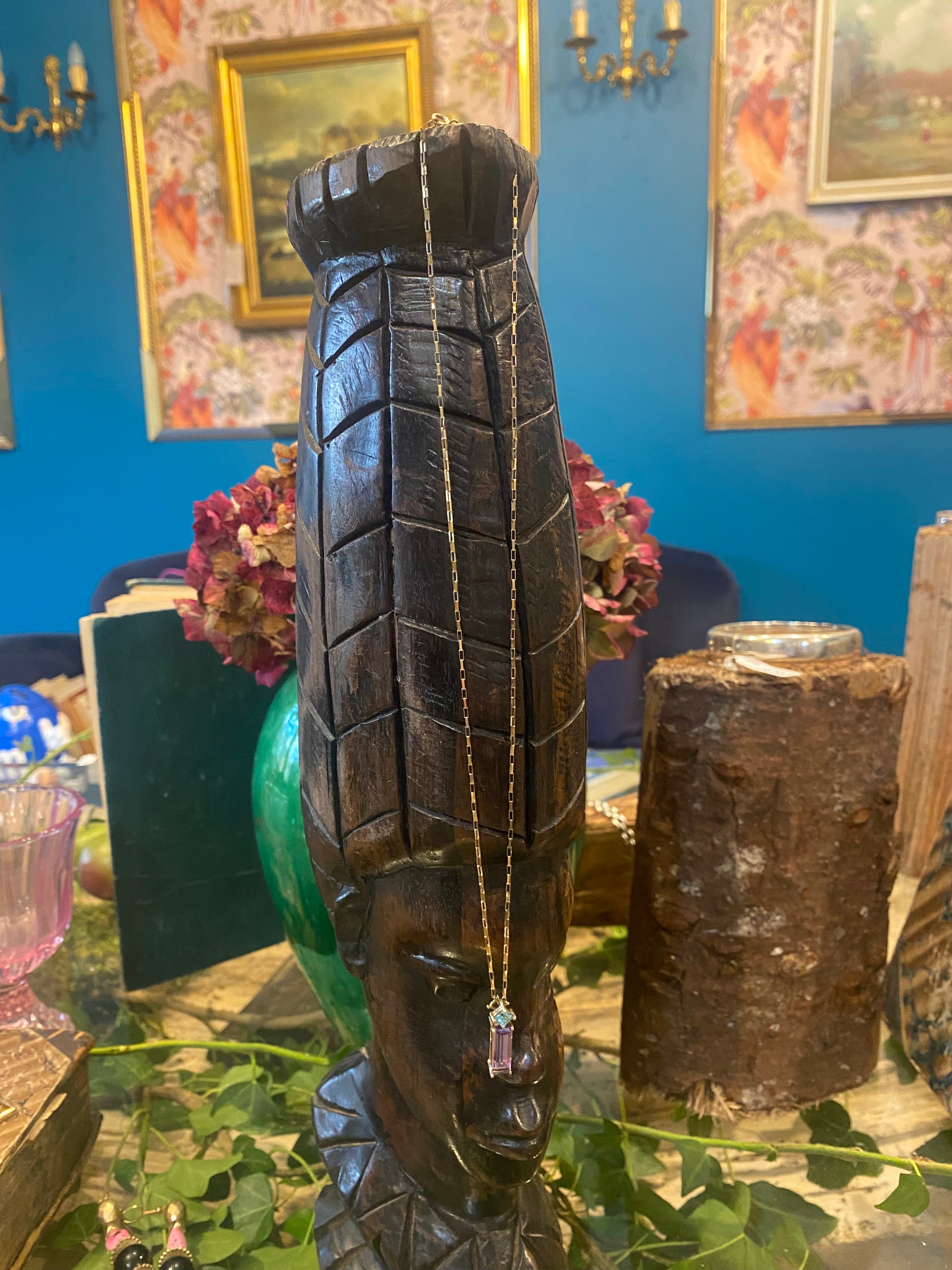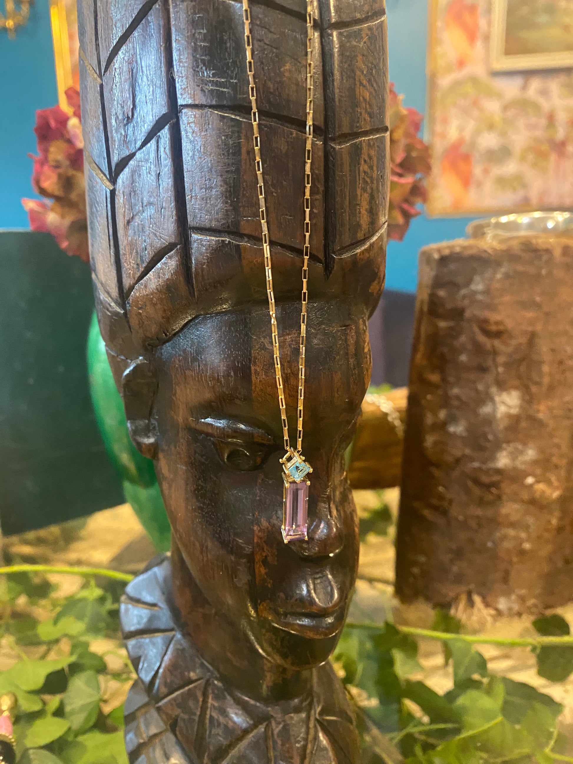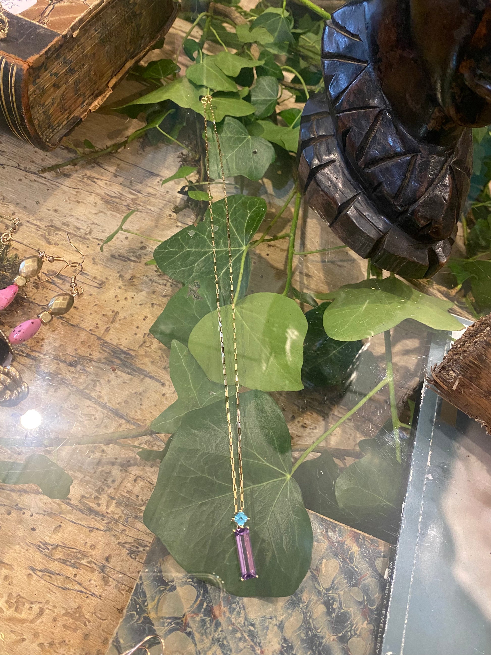 9ct gold vintage amythest & topaz pendant chain