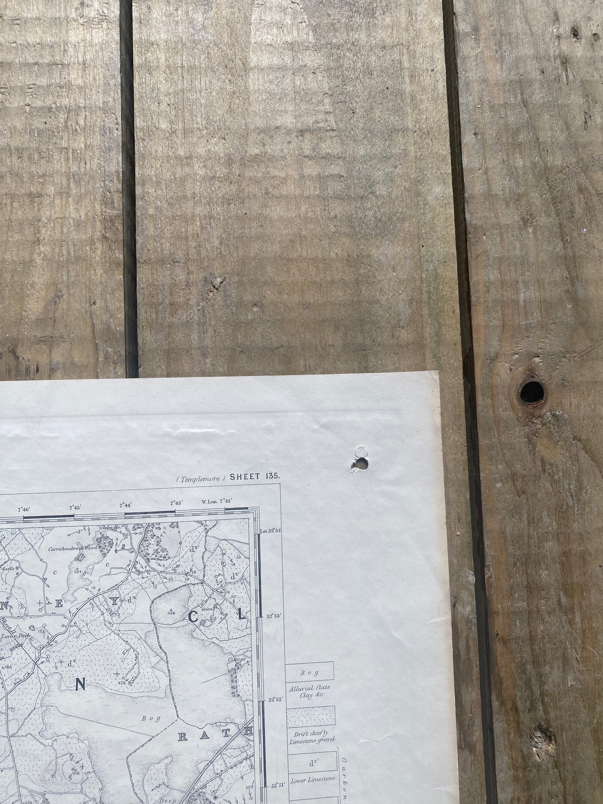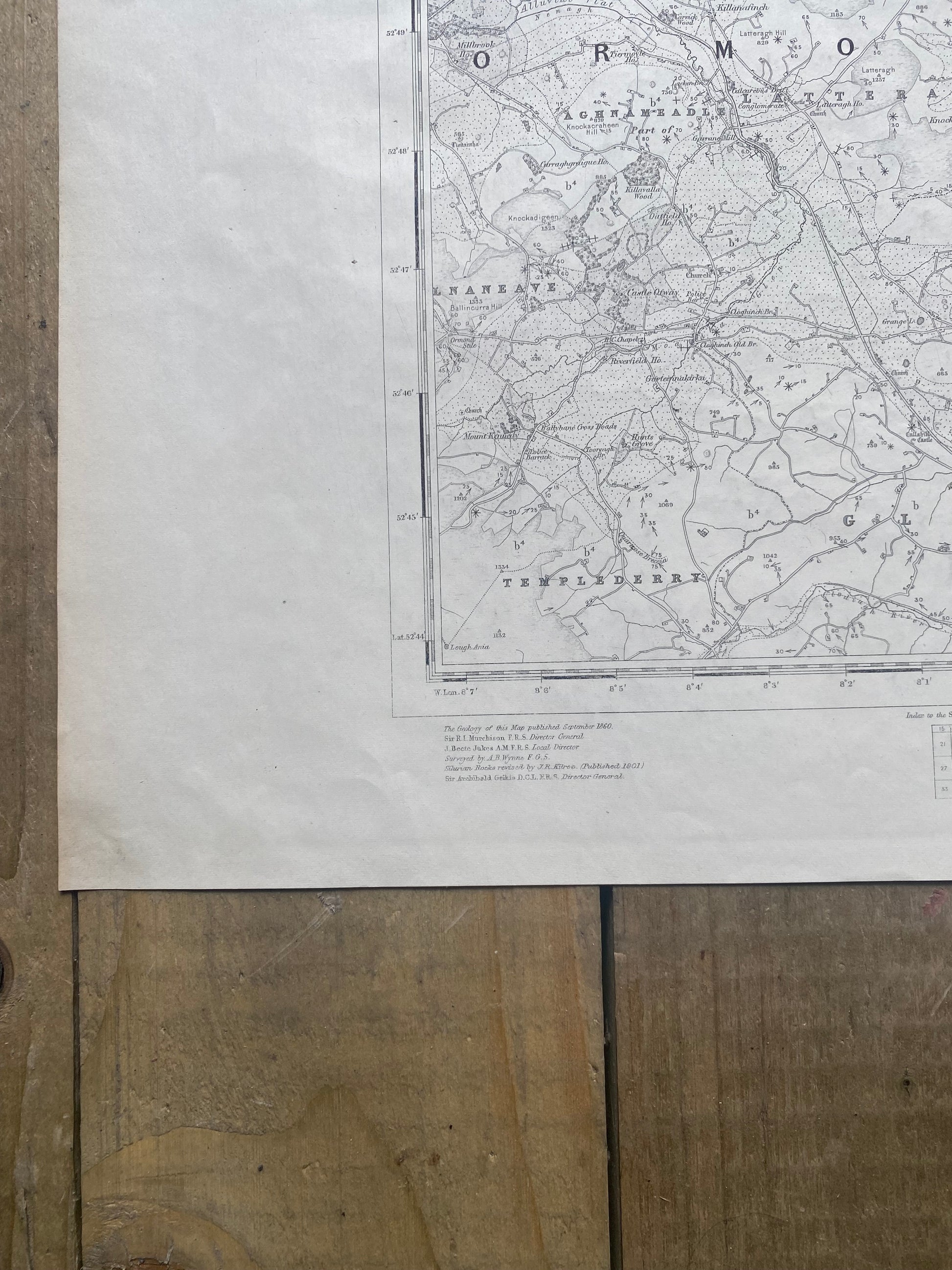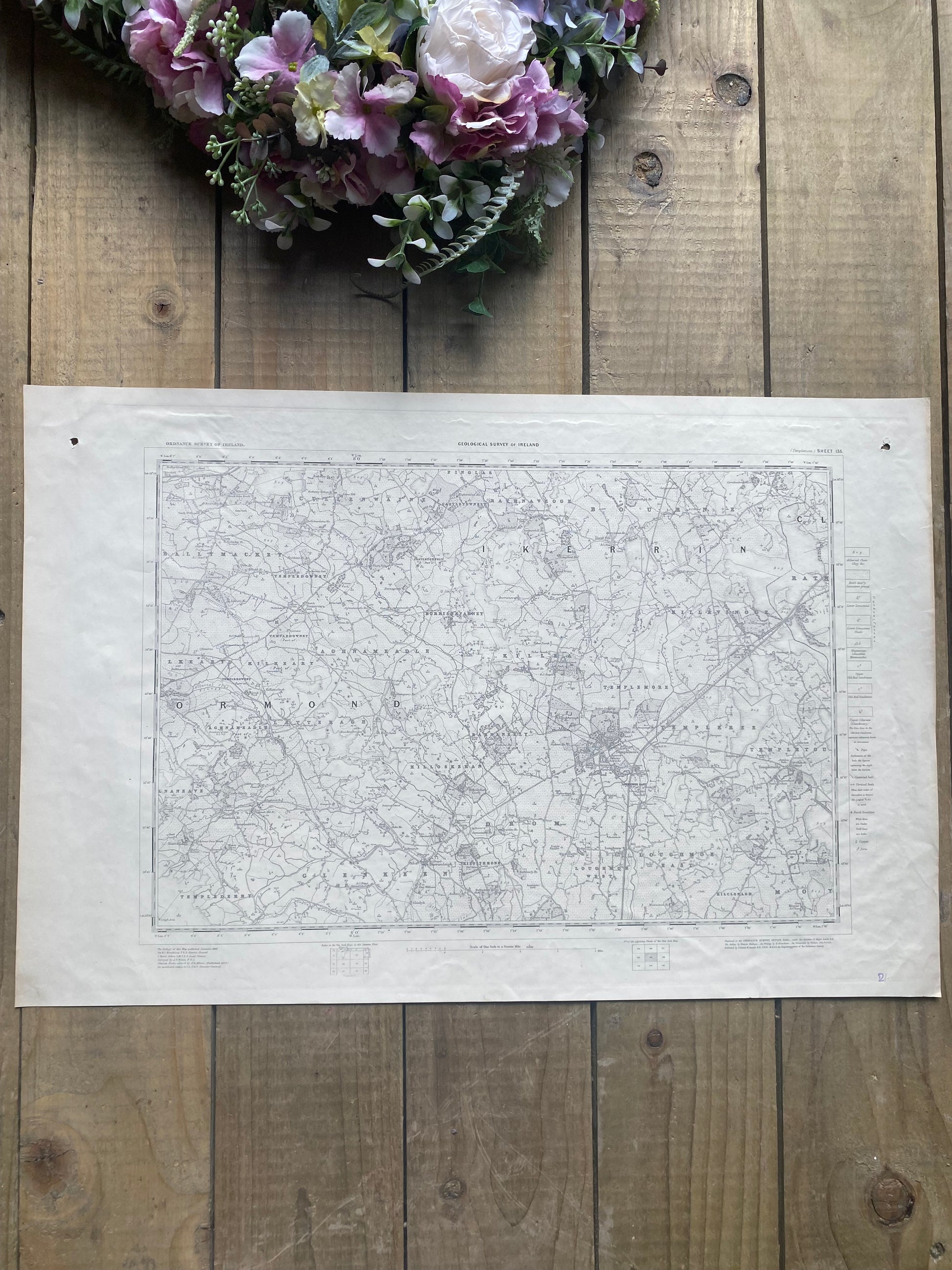 Geological survey of Ireland map of Templemore-templetouhy-borrisoleigh-Killea-Moyne-toomvara-moneygall. Co. Tipperary and parts of Co. Laois. Sheet 135. Engraved at the ordnance survey office Dublin. First published 1860. Director general; Sir. R.I Murchison (1792-1871). Scottish geologist and member of Geological Society of London. Antique Map. 24 inch x 19 inch . Unframed